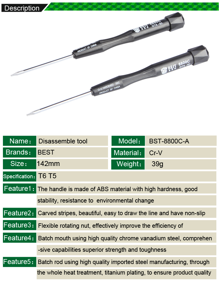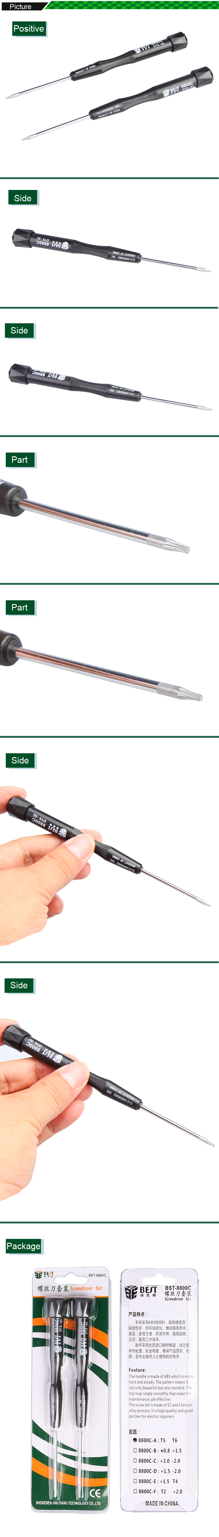 3. T3 T4 T5 T6 T6, T8, T10 Torx, ph0, PH00, PH000 Phillips, Schlitz-2.0, 0.8,1.2,1.5 Pentalobe 5 Sterne; Tri-Wing 2.5,3.5; Sie können das Modell entsprechend Ihrer Nachfrage wählen. OEM ist für uns akzeptabel