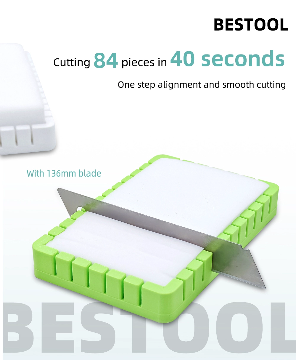 With precision industry slotting technology, it cuts sponge sheets into perfectly uniform blocks—as small as 1x1cm—neatly and evenly in seconds. Thanks to its integrated 136mm blade and one-step alignment system, you can cut up to 84 pieces in just 40 seconds, smoothly and safely.