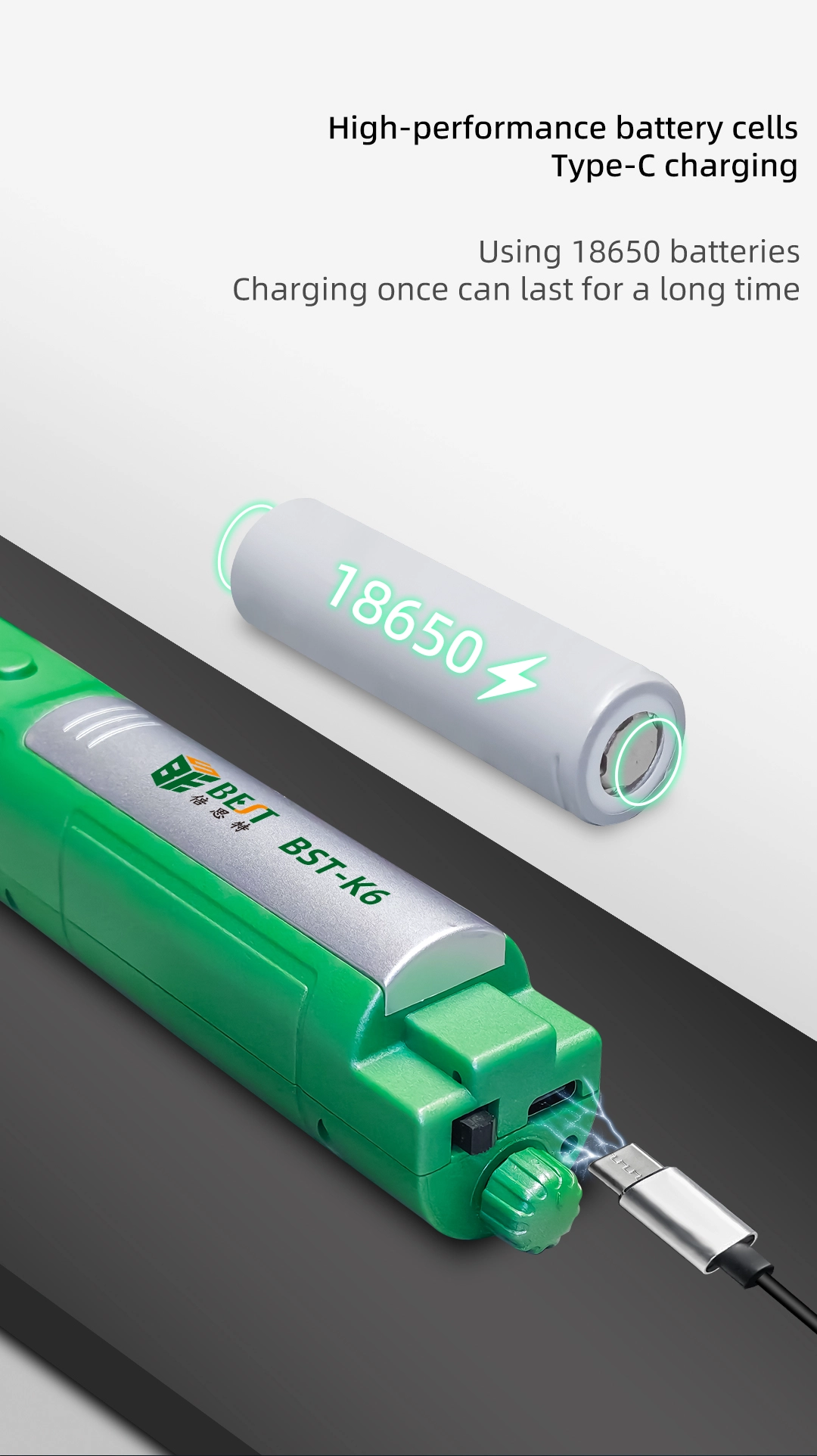 The device features independent buttons for freely switching between clockwise and counterclockwise rotation, making operation smooth and convenient. Adapt to any repair environment with infinite speed adjustment, allowing you to control the rotation speed precisely. Powered by a high-performance 18650 battery cell with Type-C charging, the BST-K6 guarantees long-lasting endurance for continuous work.